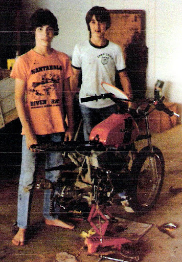 Now, this is MY first motorcycle. It's a Kawasaki KD 80. Apparently me and Huckleberry Fin, better known as Josh, were taking it apart just to take it apart. It's the only picture I could find of the bike. I have told my wife this, so I guess I can tell you too, I have never had more fun doing anything in my life as I had riding with Huckleberry. We would get off the school bus, get home as quickly as possible, and meet to go riding. We rode like some mix between hardcore explorers and motocross stars ...it was amazingly fun. When the sun was at the top of the pine trees we knew we had to head home to get there by dinner. No one would want to miss my mom's dinner, not even for motorcycling. Apparently, she also ironed creases in my blue jeans ...how uncool is that!
